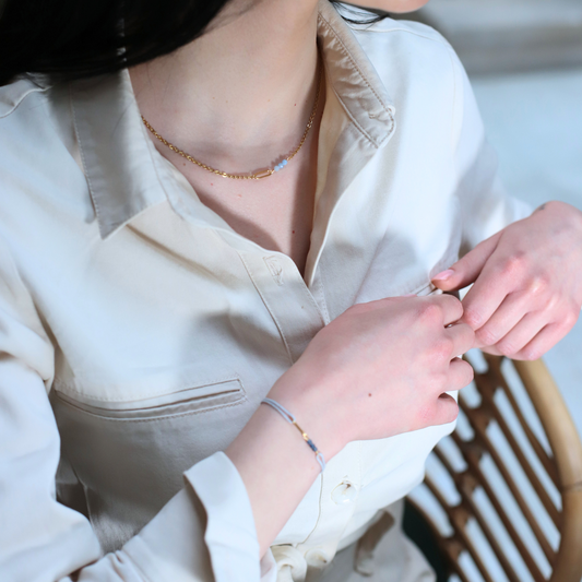 Le bracelet message secret cache un message en morse unique, sublimé par des pierres naturelles et une chaîne raffinée. Personnalisez-le à votre image !