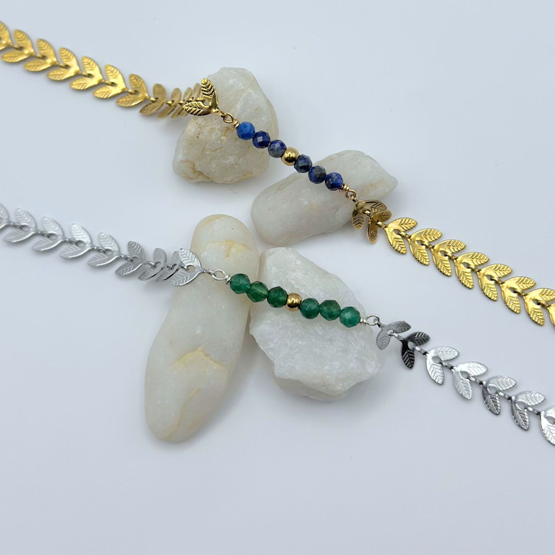 • Matériaux : chaîne et apprêts en acier inoxydable, pierres naturelles Ø 3 mm.