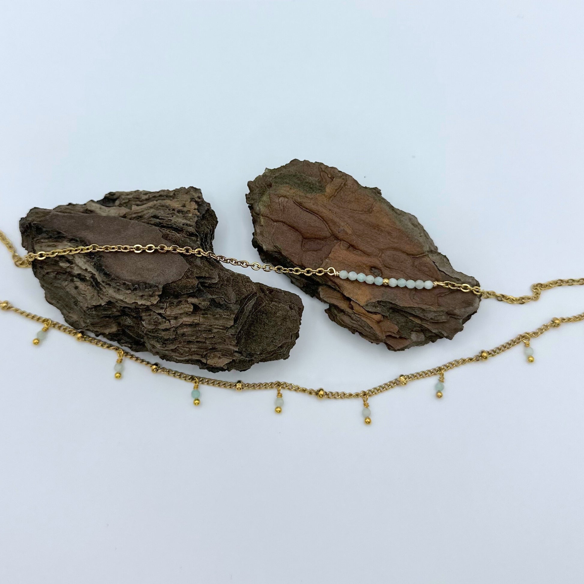 • Matériaux : chaîne fine et chaîne boule en acier inoxydable, pierres naturelles Ø 2 mm, perles dorées 2 mm et 3 mm.